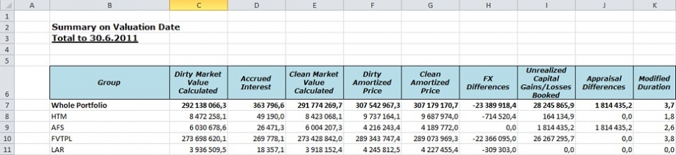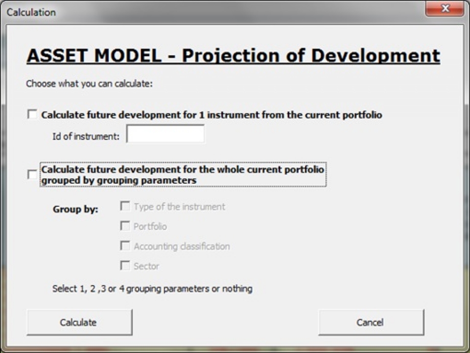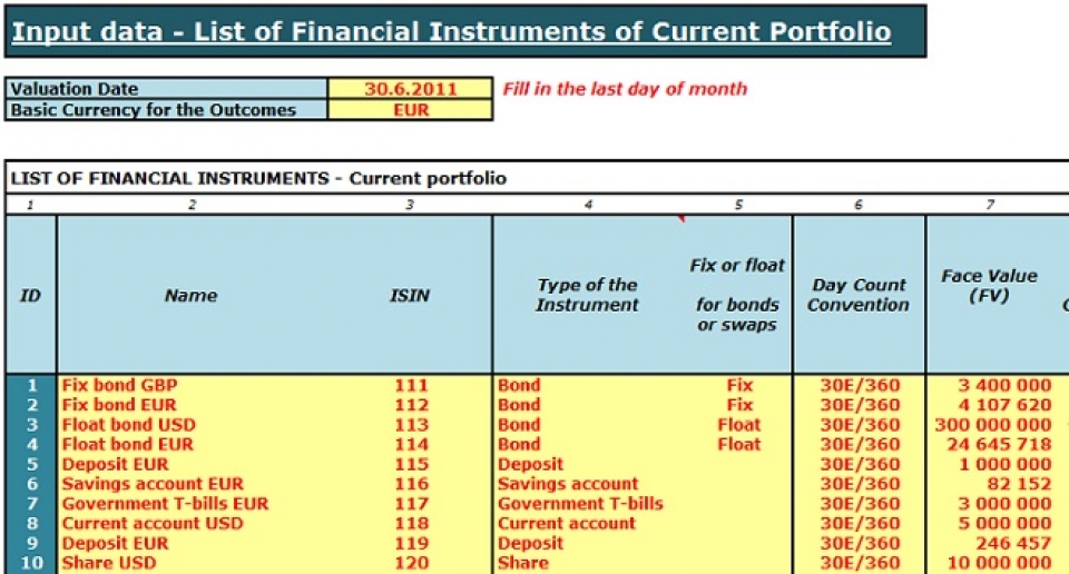 Asset Model tool is prepared (in MS Excel environment) to provide you with a projection of future cash flows, market values, amortized values, modified duration, yield indicators, and many other related variables for the defined portfolio of financial instruments. One of the inputs to the calculation also is the market yield curves of different currencies which may be prepared in the Yield Curve Fitting tool.