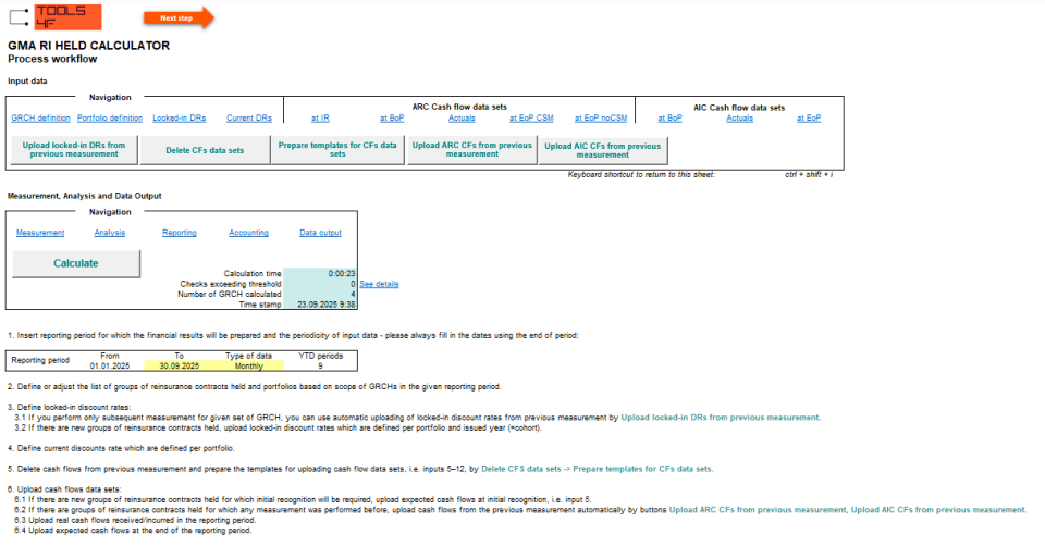 GMA RI held calculator is a tool (developed in MS Excel environment) to measure the Asset for Remaining Coverage and Asset for Incurred Claims by the General Measurement Approach (GMA) based on the requirements of the new international accounting standard IFRS 17 and our experience with its implementation.