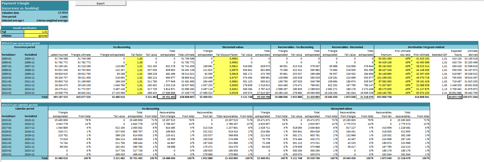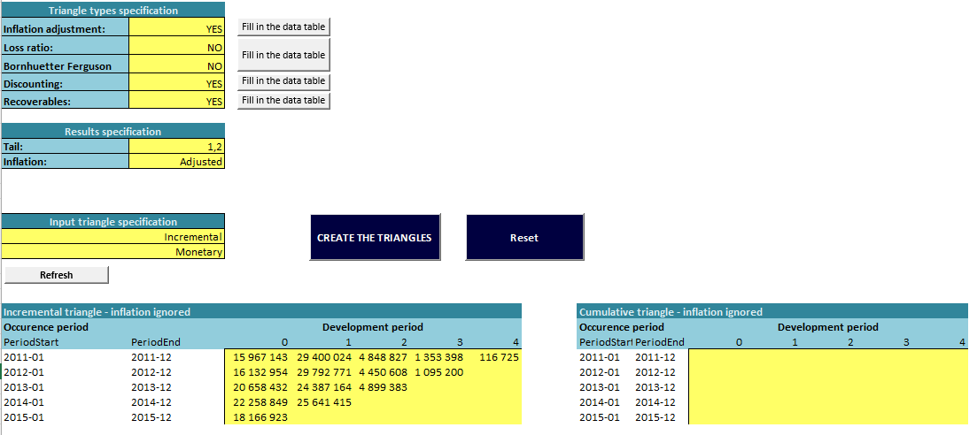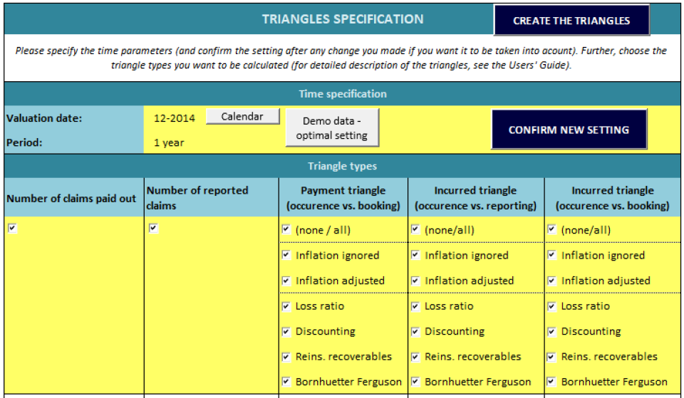 The Claims Reserve Calculator is a tool (developed in MS Excel environment) prepared for controlled calculation of claims reserves. Several chain-ladder approaches, including discounting and inflation adjustments, as well as the Bornhuetter-Ferguson method, are implemented in the tool. Many analytical features are prepared to make your final decision as relevant as possible.