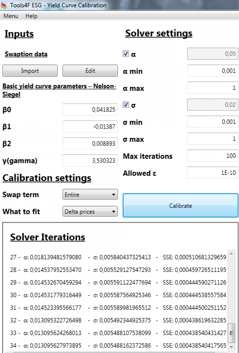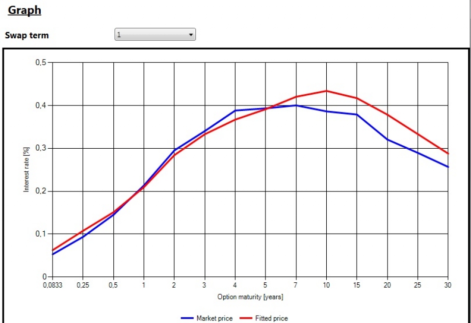 ESG - Yield Curve Calibration tool is prepared for fast and efficient calibration of the one-factor Hull-White model parameters with several analytical features to help you decide about the most relevant results. Market yield curve - possibly created by Yield Curve fitting tool - is one of the inputs to the calibration. Outputs from this tool may then be used as inputs to the ESG - Yield Curve Simulation tool.
