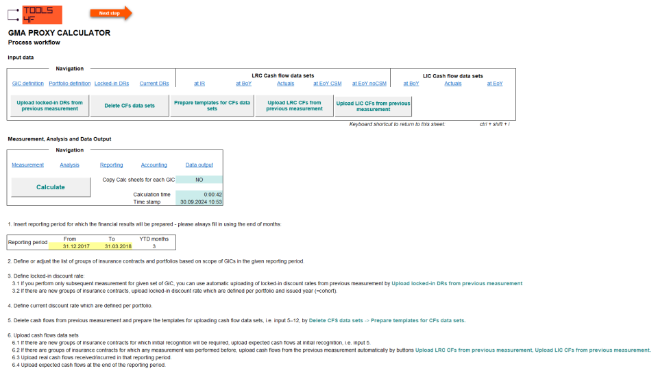 GMA proxy calculator is a tool (developed in MS Excel environment) to measure the Liability for Remaining Coverage and Liability for Incurred Claims by the General Measurement Approach (GMA) based on the requirements of the new international accounting standard IFRS 17 and our experience with its implementation.